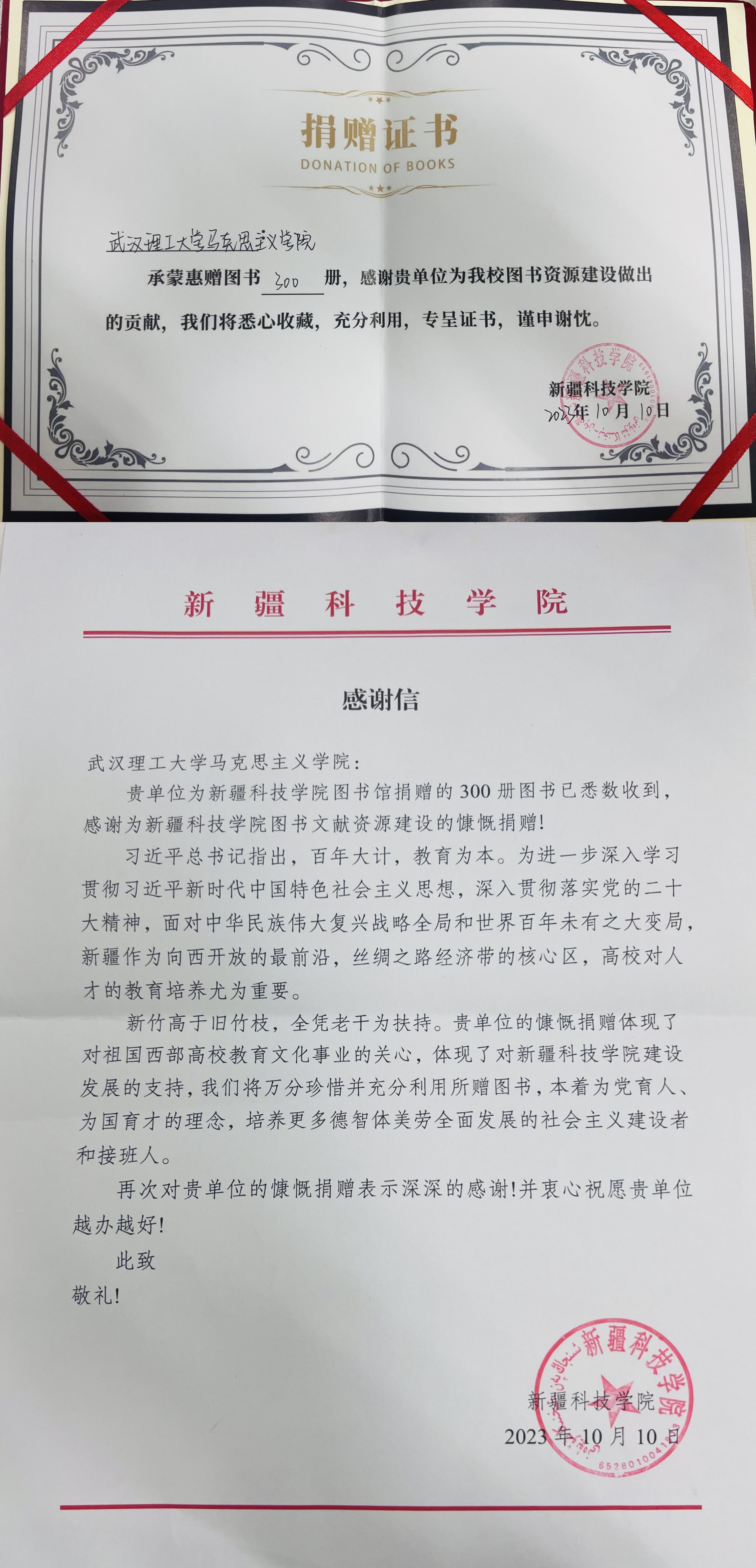 赠人玫瑰,手有余香,新疆科技学院收到书籍后,第一时间向学院寄来了捐赠证书和感谢信。