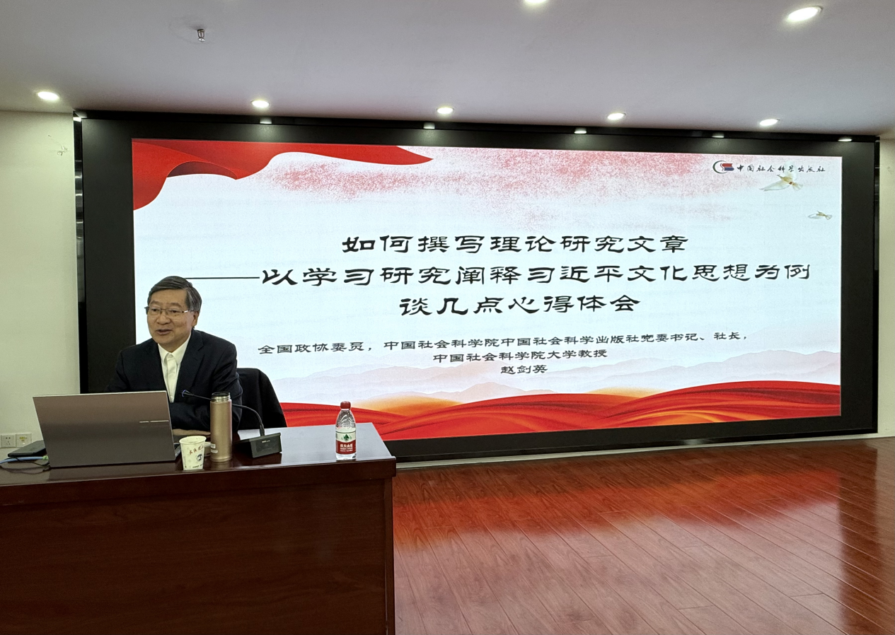为培育浓厚研学风气,提高研究生学术视野与课题攻坚能力,学院于10月23日上午在弘毅楼1405报告厅举办求是学堂第202期学术报告会。本次报告会围绕如何撰写理论研究文章——以学习研究阐释习近平文化思想为例谈几点心得体会展开报告,特邀第十四届全国政协委员、中国辩证唯物主义研究会副会长、中国社会科学出版社原党委书记、社长赵剑英教授主讲,学院院长雷江梅主持,学院教师及2024级全体硕、博研究生参会。
