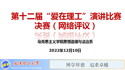 12月10日晚19:00,武汉理工大学第12届“爱在理工”演讲比赛决赛(网络评议)通过腾讯会议举行。“爱在理工”演讲比赛是马克思主义学院 “一课一品”系列教学活动的标志性品牌之一,今年,为推动学习二十大报告精神,展望社会主义现代化强国战略目标,马克思主义学院联合校团委继续开展以“爱在理工”为主题的演讲比赛,将二十大报告精神的学习教育融入“思想道德与法治”课程中。