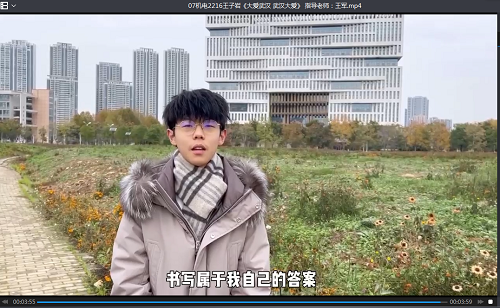 比赛中,主持人王军老师依次播放17位参赛选手提交的演讲视频。有的选手歌颂伟大的党和祖国,抒发自己身为中国人的自豪感和爱国热情;有的选手介绍自己家乡悠久的历史文化、抗击外敌的感人故事、治理沙漠的人间奇迹,表达对家乡的爱;有的选手将自己爷爷、父亲和哥哥从事农业生产的故事娓娓道来,赞美父辈的勤劳踏实,讴歌新时代的发展变迁;有的选手分享了武汉理工大学的老师、后勤人员和同学带给自己的帮助、鼓励和善意,致敬我们的学校;有的选手从切身经历和感受出发,讲述对青春、生活的热爱……同学们的演讲或激昂或委婉,以饱含真情实感的语言表达着对国家,对家乡,对父母,对学校,对生活的热爱。