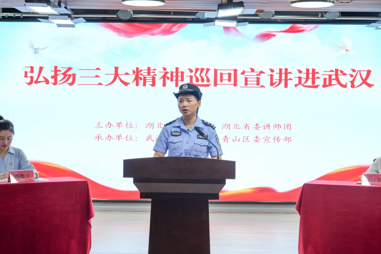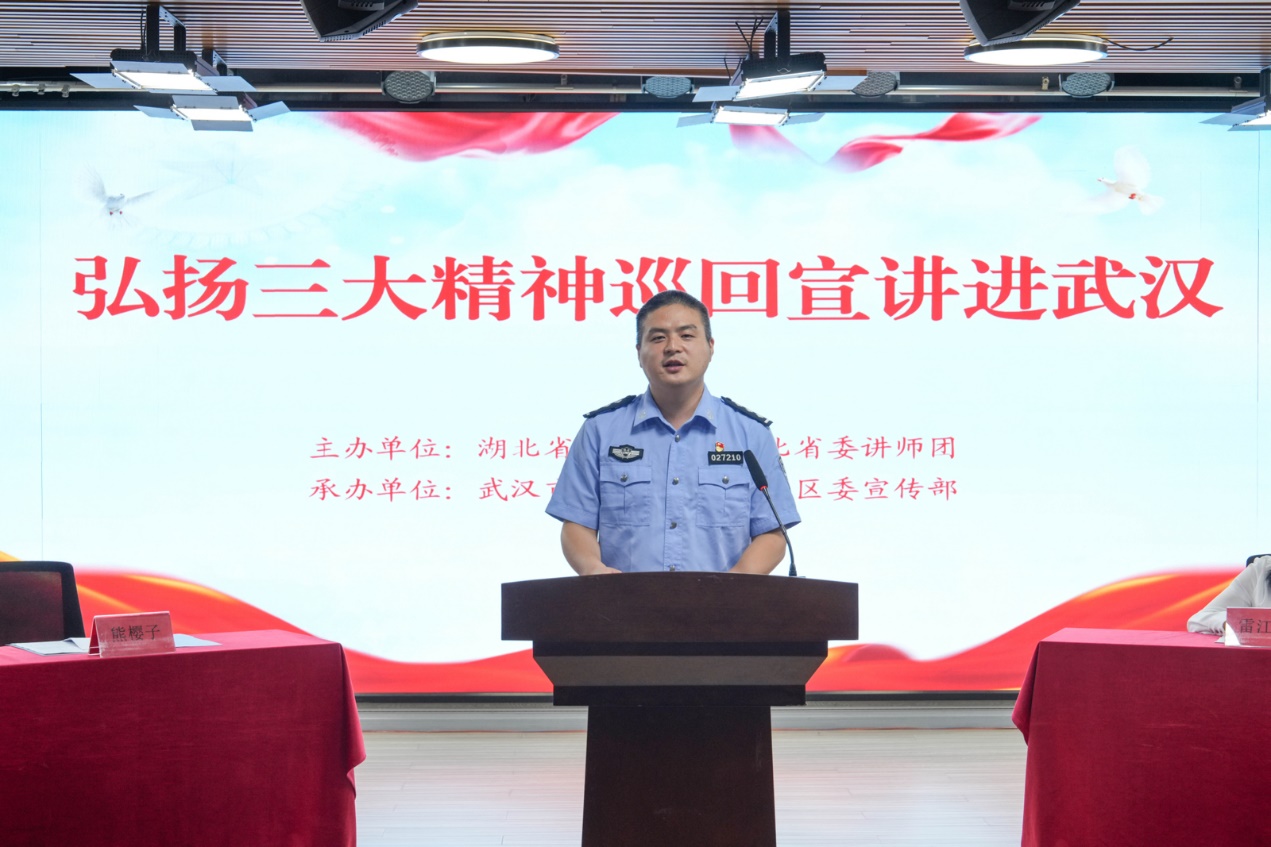 2020年初,武汉市公安局江汉区分局法制大队教导员涂可蔼在抗疫一线不幸感染,治愈出院并度过隔离期后,他推迟原定的婚礼,主动请缨进入方舱医院,用亲身经历鼓励一位位患者。如今,在基层岗位,他服务群众,解决难题,扛起新时代青年民警责任使命。他的亲身经历让在场的听众无不动容。他说:“作为青年民警,我从内心深处感谢这段抗疫的经历。因为它所迸发出来的伟大抗疫精神,让我变得更加坚毅和勇敢,激励着我不忘初心、砥砺前行。”