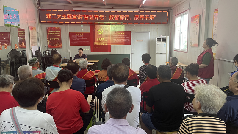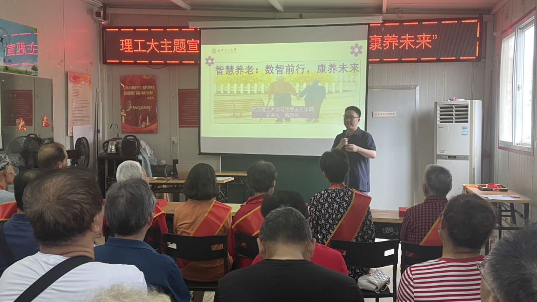 在武汉市青山区钢花村街道114社区活动室,武汉理工大学马克思主义学院教授梅运彬以“智慧养老:数智前行 康养未来”为主题,向居民们普及智慧养老理念。
