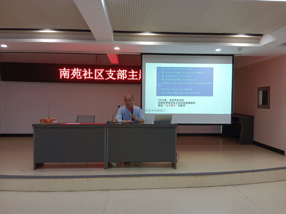 武汉理工大学副教授王祝福走进南苑社区,通过详实的案例和生动的阐述,为党员们带来了一场深刻透彻的主题宣讲。他列举了近年来我国在文化领域取得的显著成就,比如故宫博物院通过数字化手段,让古老的文物“活”起来,走进大众的视野,让更多人领略到中华传统文化的魅力;还有在全球范围内兴起的汉语热,越来越多的外国人热衷于学习汉语,了解中国文化,充分展现了中国文化的强大吸引力和影响力。
