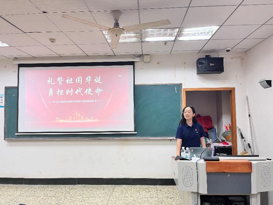 为深入学习贯彻习近平新时代中国特色社会主义思想,礼赞祖国76周年华诞,切实增强支部成员的使命担当。2025年10月14日晚8时,学院2024级研究生第三党支部在弘毅楼713开展“礼赞祖国华诞 勇担时代使命”主题党日活动。活动由党支部书记周雯倩同志主持,支部全体成员参与。