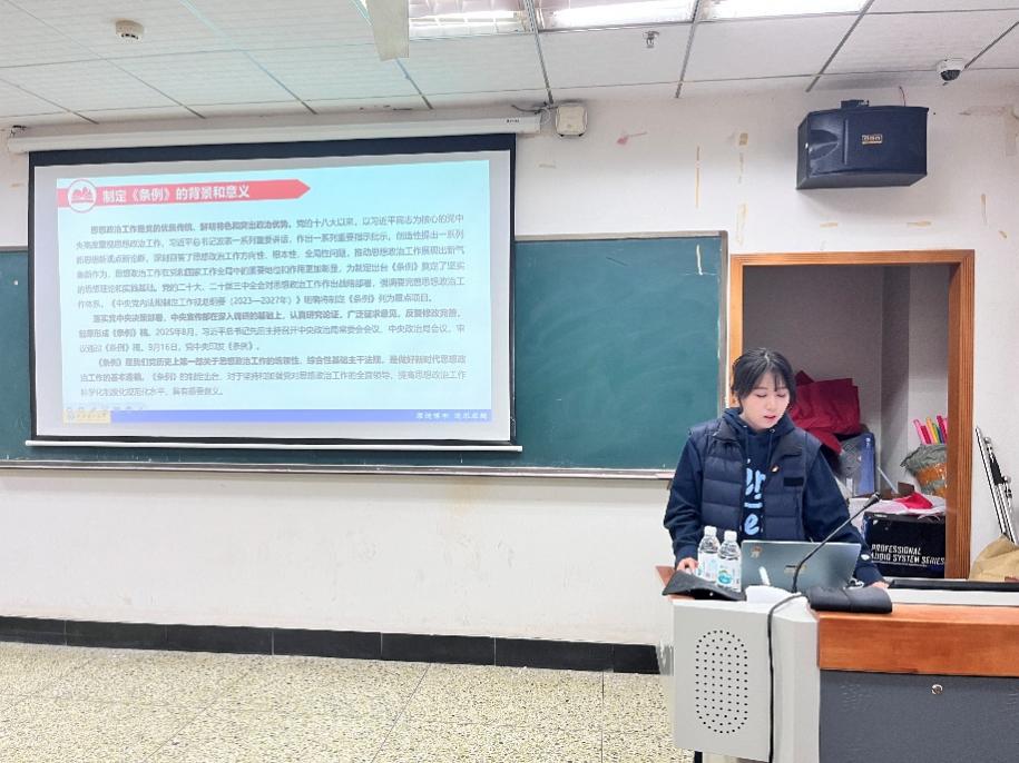 接着,姚烨同志则聚焦《中国共产党思想政治工作条例》,详细介绍条例制定的背景意义、总体框架与核心要求。她指出,该条例作为党历史上首部思想政治工作统领性法规,是做好新时代思想政治工作的基本遵循,支部成员需准确把握思政工作条例相关原则,将思政学习成果转化为实践动力。