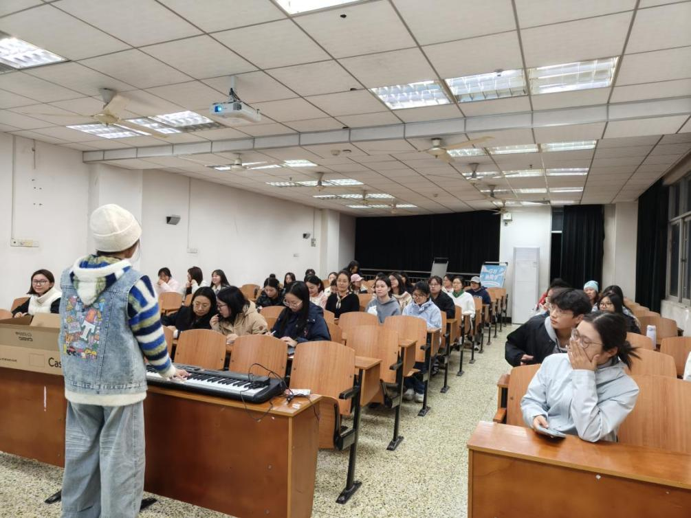 排练过程中,指导老师梁陈芷依带领同学们进行系统的开嗓练习,帮助大家掌握科学的发声方法。随后,梁陈芷依老师根据团员们的音域特点进行了声部划分,确立了合唱团的基本架构。在基础乐理教学环节,梁陈芷依老师细致讲解了简谱与五线谱的基础知识,为零基础同学快速入门提供了有力支持。最后,在梁陈芷依老师的带领下,全体团员共同练唱了《十送红军》的前面部分,初步熟悉了这首经典歌曲的旋律风格。