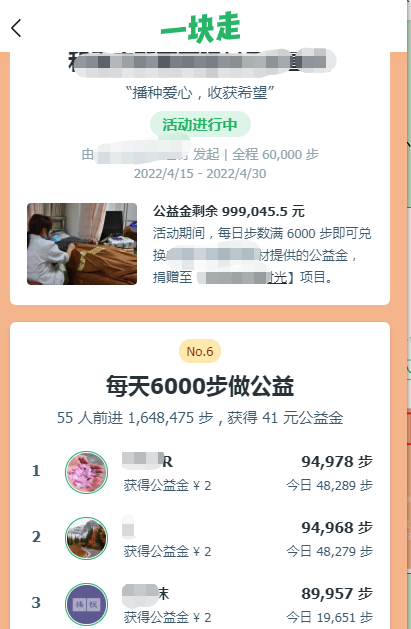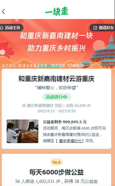 该活动以各二级单位为主体,通过扫码腾讯公益平台“一块走”小程序组建“xx学院/处/中心”一块走活动团队。活动期间,师生扫码进入单位团队(一个单位团队一个二维码),以团队名义进行步数捐赠(6000步起捐),每次捐步既可为“童享阳光”困境儿童助养计划项目获得0.6元的企业配捐资金、0.5元的腾讯配捐资金。活动结束后捐步前50名的个人将会获得湖北省慈善总会的荣誉证书,成绩优异的单位将会获得组织荣誉,同时此次活动的参与情况将纳入年终考核中,希望各单位积极参加,用脚步丈量爱心,用行走助力慈善!