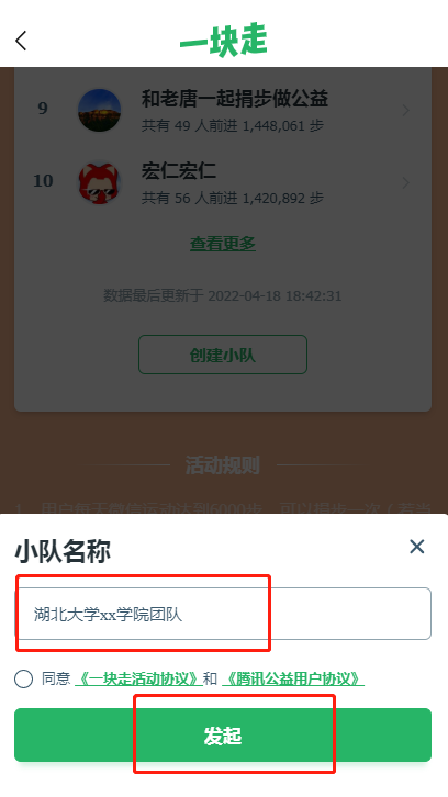 1.扫码(二维码活动开始前提供)进入“童享阳光”项目一块走界面,下拉至底部点击—创建小队