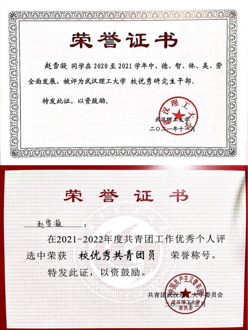 入学伊始,她就决心勇敢挑战自我、多维提升自己。通过竞选,成功当选为学院研究生会主席团成员。在任职期间,她认真处理业务、积极沟通对接,配合学院领导和老师对各部门进行工作部署与持续跟进,对研究生会内部进行日常的统筹管理,组织、主持了多次内部例会及理论学习。在任期内,她策划组织了“学思践悟”宣讲比赛、第三届“青春在马”红歌会、三院联谊、权益月等等各类比赛活动,并配合学校、学院开展了其他课外活动。每个改变与突破,就是通往一个新世界,曾经的“社恐”通过不懈努力和不断历练蜕变成了勇于担当、善于沟通的“校级优秀学生干部”。