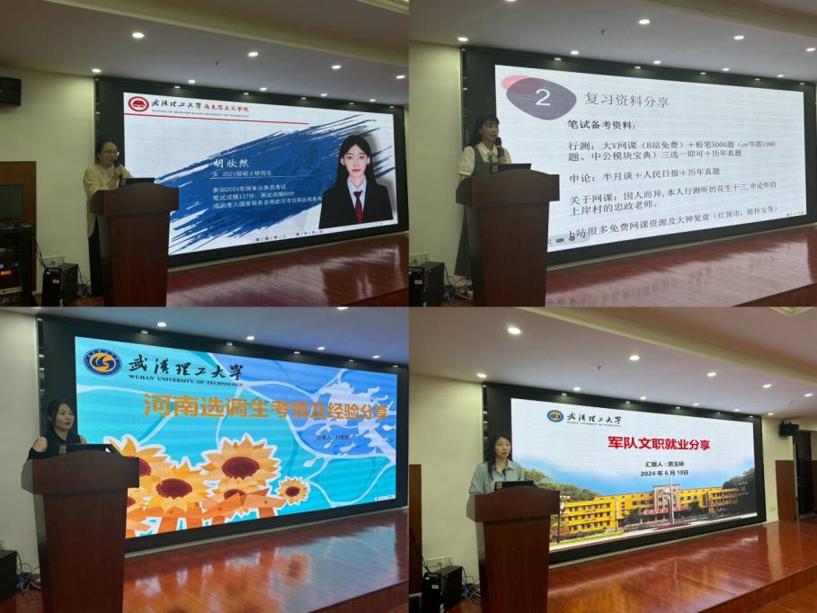 为引导学生树立正确的择业观和就业观,切实提高研究生就业能力,6月18日下午2时,学院在弘毅楼1405报告厅举办“青春在马·携你同行”就业指导系列活动考公专场讲座,邀请到我院2024届毕业生胡欣然、付美慈、贾玉婷分别从国考、选调生、军队文职三个方向来分享经验。本次讲座由研究生辅导员余沁芳老师主持,2022级、2023级研究生参加。